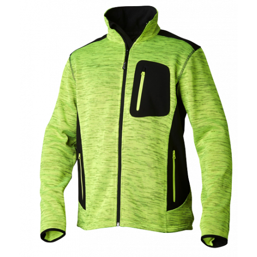Stickad fleecejacka med detaljer av Softshell. En bröstficka med dragkedja. Två